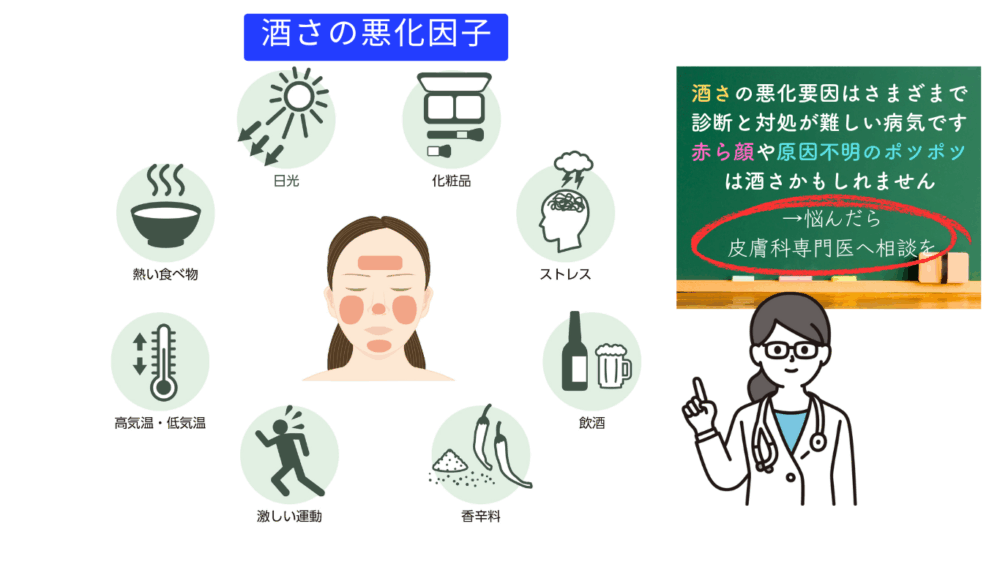 一般的に「赤ら顔」と呼ばれる酒さは、顔の赤み・ほてり・ひりつきから始まり、悪化するとニキビのような赤い発疹が増えていく皮膚の病気です。不適切にステロイド等の塗り薬を続けたことで発症する「ステロイド酒さ」という概念もありますが、生まれもった肌質や環境、スキンケアも大きく影響します。毛包・皮脂腺・血管の周囲で免疫が過剰に反応し、炎症が引き起こされることで発症すると考えられています。飲酒・辛いもの・運動・日焼け・スキンケアによる刺激など悪化要因は多岐にわたるため、生活習慣の改善も重要になります。