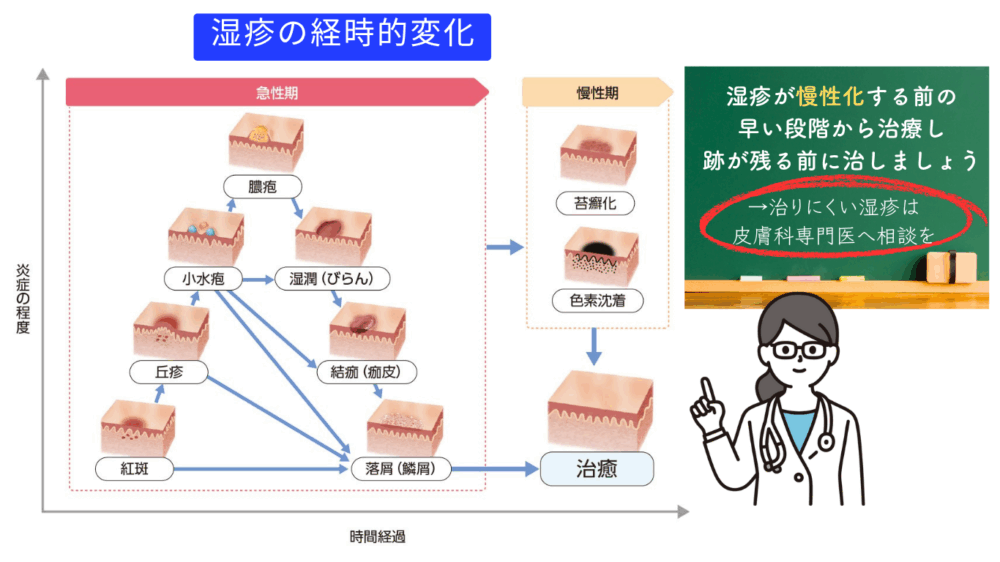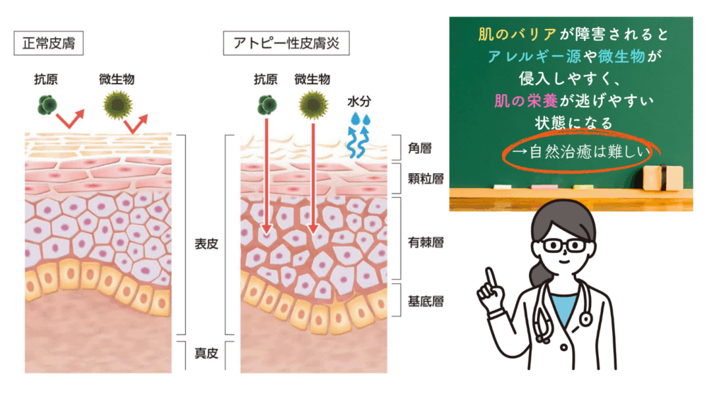 主な症状は「湿疹」と「かゆみ」で、良くなったり悪くなったりを繰り返すのが特徴です。原因としては「皮膚のバリア障害」「免疫の過剰反応によるアレルギー炎症」「かゆみによる掻破」の3つの要素が関連して発症すると考えられています。