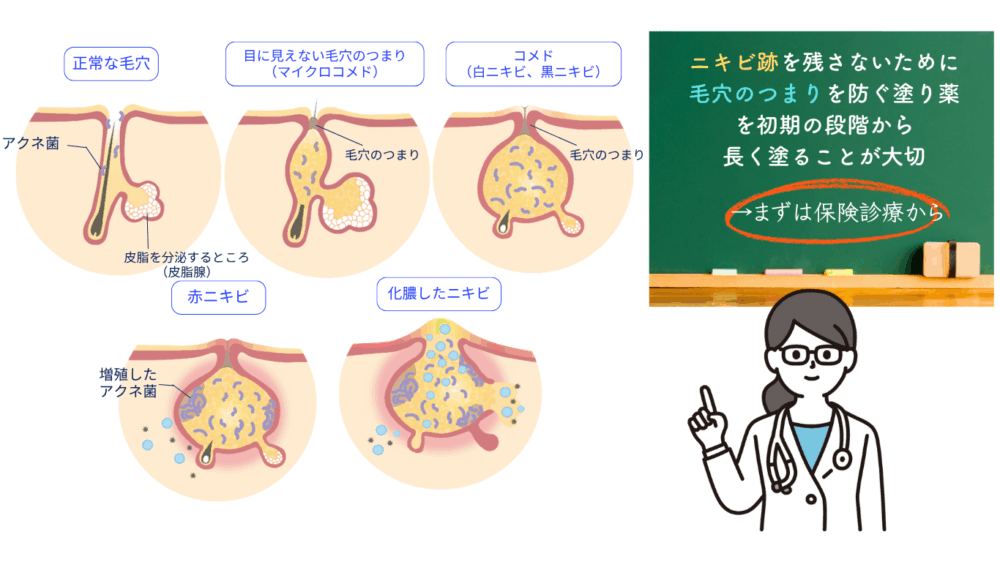 ニキビ跡を残さないためには炎症がひどくなるより前に、早い段階からの治療が大切です。