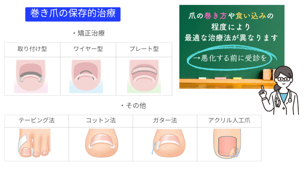 また陥入の原因が巻き爪である場合、巻き爪矯正治療(自由診療)による改善が期待できます。重症度や巻きの形状に応じて、最適な治療法をご提案いたします。