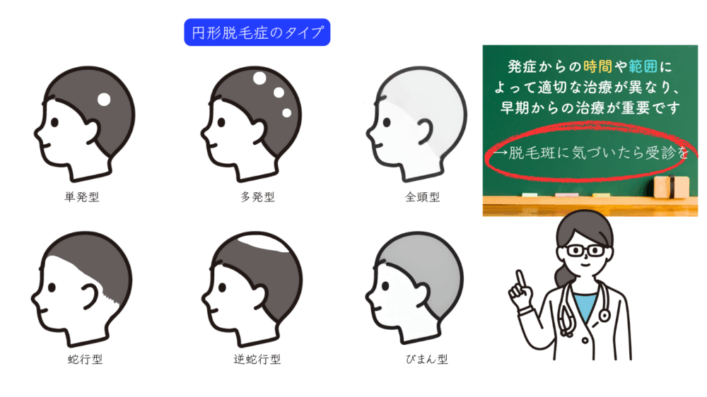 円形脱毛症は、自分の正常な毛包を、自らの免疫が間違って攻撃してしまうことで発症する病気です。詳しい原因については解明されておらず、体質によって症状を繰り返す場合があります。治療法は脱毛の範囲や発症からの期間によって異なり、塗り薬や飲み薬、注射、紫外線治療など様々な選択肢があるため、病状を正確に見極めることが重要です。