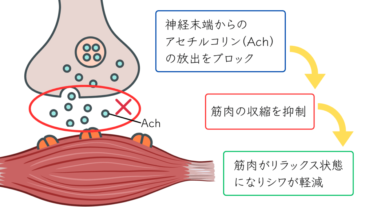 ボトックスは、神経から筋肉へ収縮の指令を伝える神経伝達物質「アセチルコリン」の放出を阻害することで、筋肉の動きを抑制します。