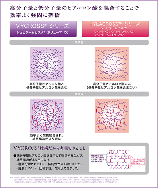 バイクロスシリーズは、ジュビダームビスタのなかでも最新かつ最上位のヒアルロン酸製剤で、分子同士の結合が強く網目構造が密になっていることから、酵素分解されにくく持続性が高くなっています。ジュビダームビスタには6種類あり、それぞれの特徴によって適応部位や持続期間も異なってきますが、約9ヶ月~24ヶ月持続するといわれています。それぞれ硬さや粘度が異なるため、シワの深さや部位、求める効果に合わせて最適な製剤を選択できます。