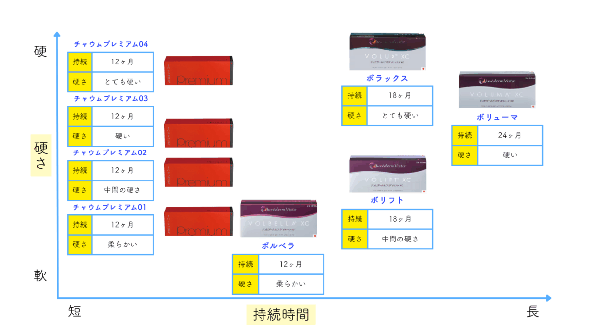 チャウムプレミアムは最新の架橋技術によりヒアルロン酸の粒子が非常に細かくなっているため肌になじみやすく、自然な仕上がりになりやすいのが特徴です。ナチュラルな変化を目指す方にもおすすめです。柔らかく、細かな部分の繊細な形成に優れており、デザイン性にも優れています。麻酔入り製剤のため痛みを最小限に抑えることが出来ます。その有効性はMFDS(韓国食品医薬品安全庁)、EDQM(欧州医薬品衣料品品質部門)によって認可されており、日本だけでなく、世界中で使用されています。持続期間は1年程度と言われております。