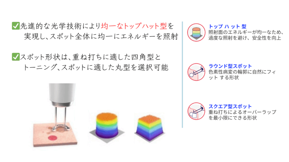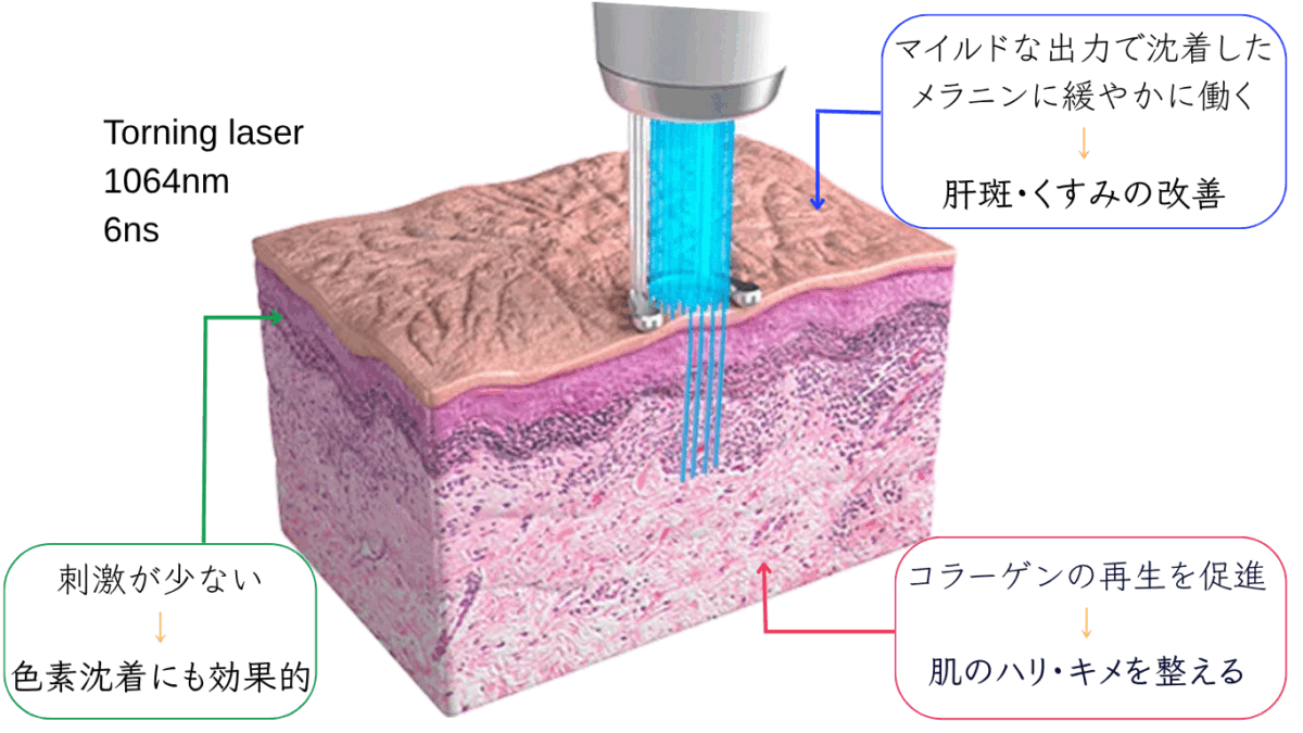 レーザートーニングは、低出力でレーザーを照射するので、過度な刺激を与えずにメラニンの排出を促すことができます。